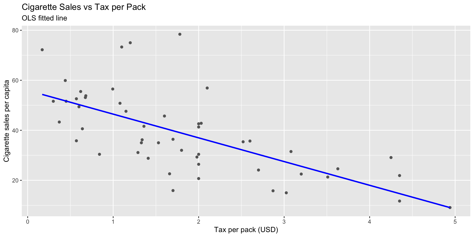 cigsales on cigtax, interpret the slope’s sign and magnitude.Under what condition can the regression coefficient \(\beta\) be interpreted as a causal effect?