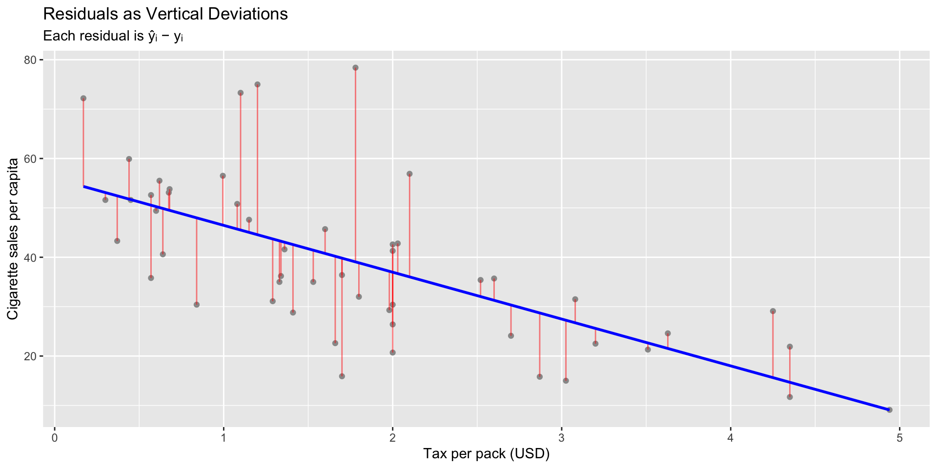 - Slope (\(\hat{\beta}\)) – change in sales per $1 increase in tax