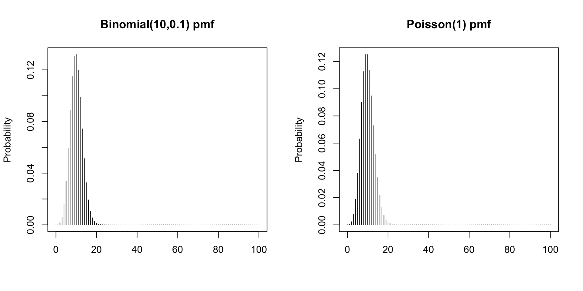 Range of possible outcome for \(X\sim\text{Poisson}(\lambda)\) are \(\{0,1,2,\ldots\}\)